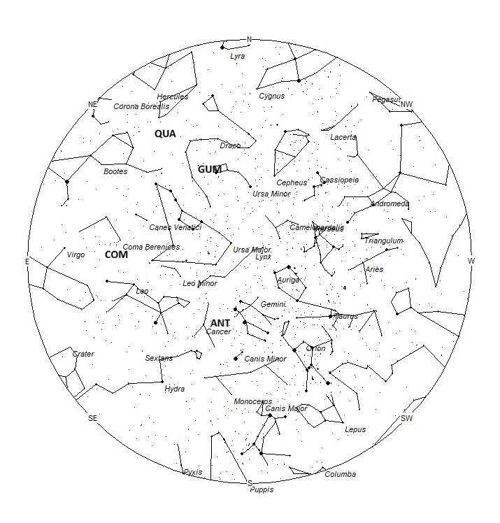 The Comae Berenicids (COM) are a long duration shower active from December 5th through February 4th. Maximum activity occurred on December 19th. The radiant is currently located at 12:04 (181) +21, which places it in western Coma Berenices, 9 degrees northeast of the 2nd magnitude star known as Denebola (beta Leonis) These meteors would be best seen near 05:00 LST, when the radiant lies highest in the southern sky. Current rates should be near 1 per hour as seen from the northern hemisphere and less than 1 as seen south of the equator. At 64km/sec., these meteors would produce mostly swift meteors.