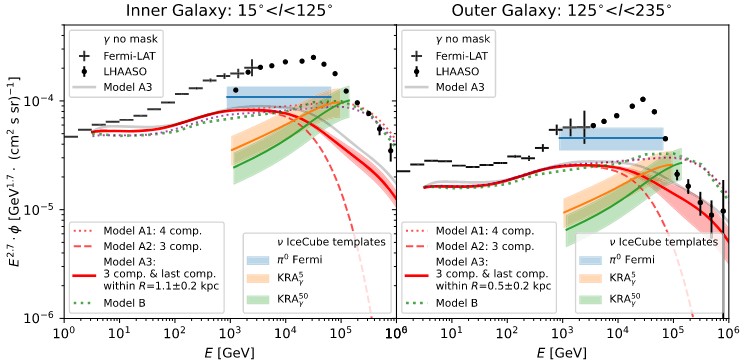 Based on models of how cosmic rays interact with the interstellar medium (ISM), the authors are able to compute what gamma-ray and neutrino emission they expect from these cosmic ray models. They compare this model-produced emission to observations of gamma-rays and neutrinos from Fermi-LAT and LHAASO. They find that their models produce gamma-ray emission similar to the data at energies < 30 TeV, but the predicted neutrino emission is slightly less than the real data, specifically in the inner region of the Milky Way.