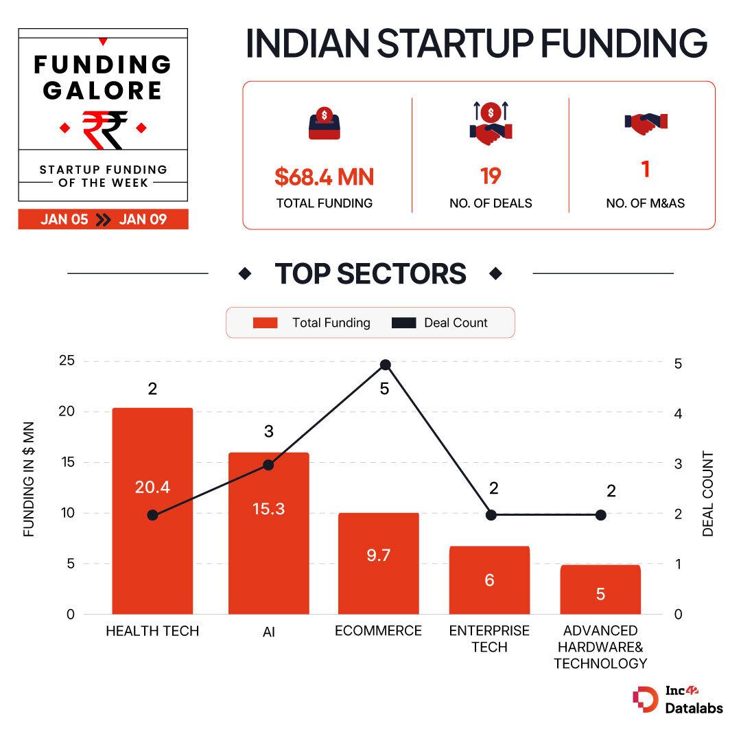 Between Jan 5 and 9, 19 startups managed to secure a fresh capital of $68.4 Mn, representing a near 34% declined from the $104.2 Mn bagged by two startups in the preceding week