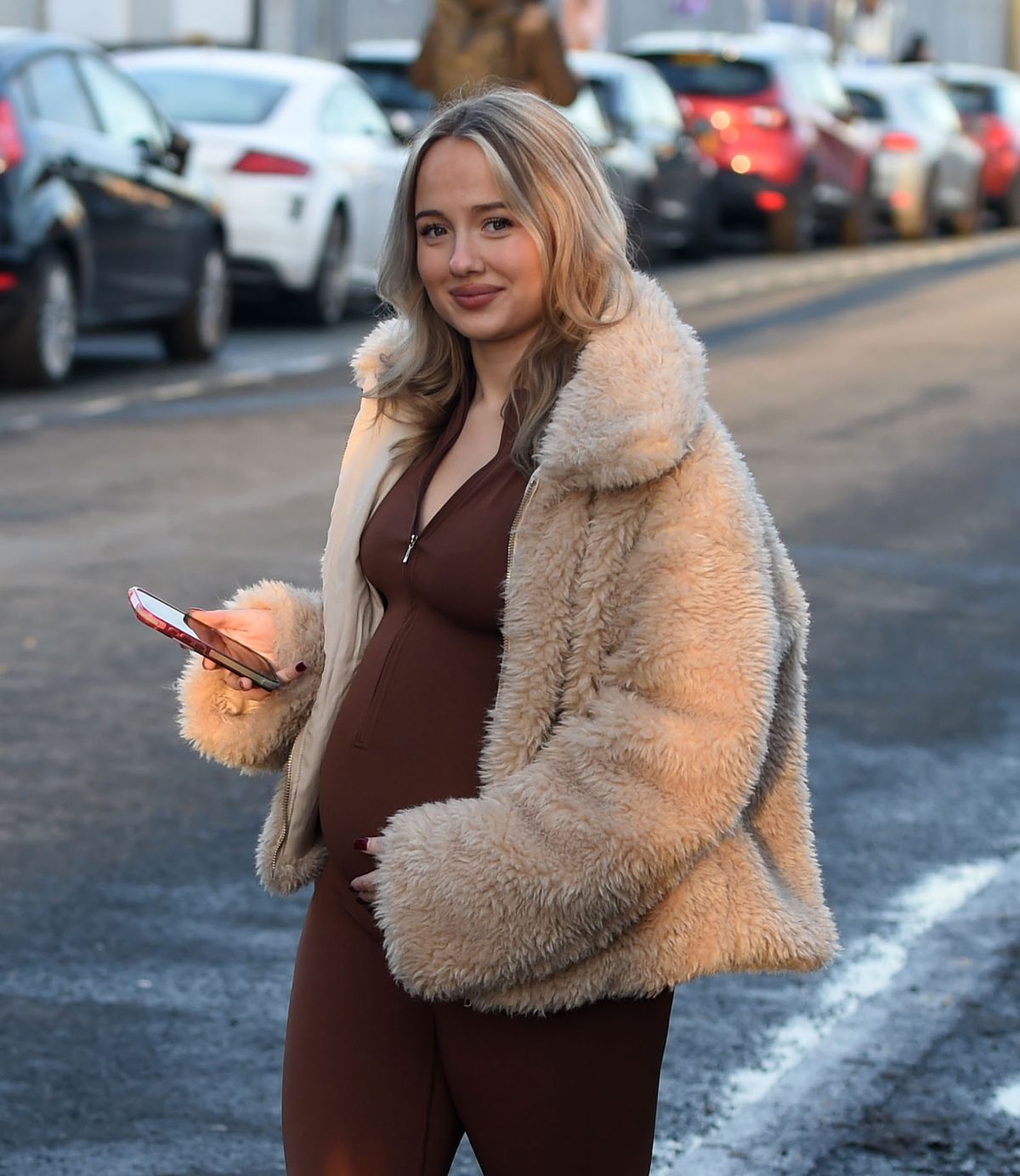 The model, who has quit Only Fans after finding out she’s expecting, was glowing with a full face of makeup. She wrapped up warm with a beige fur coat for her outing.