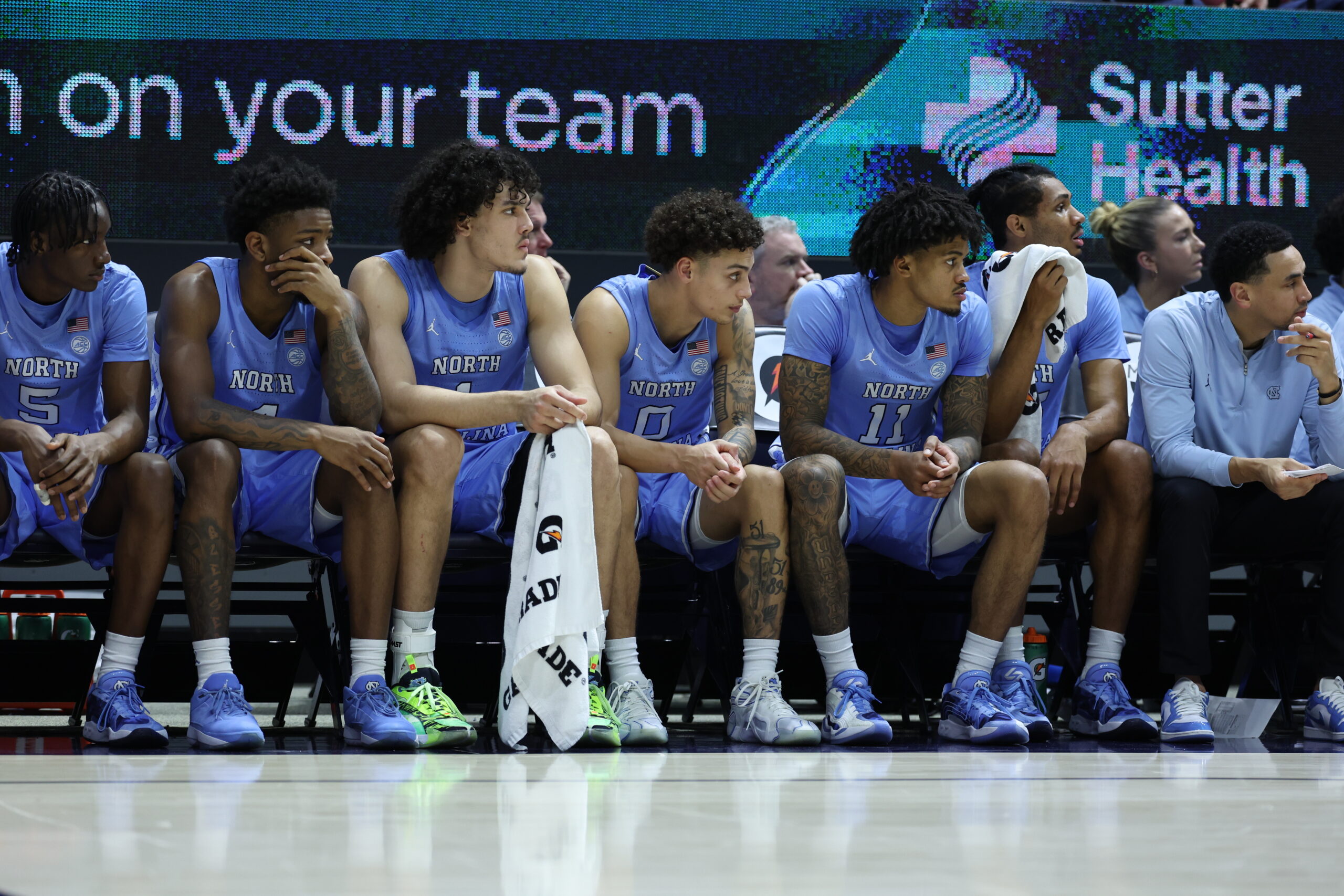 The North Carolina bench watches California during the second half of an NCAA college basketball game in Berkeley, Calif., Saturday, Jan. 17, 2026. (Photo via AP Photo/Jed Jacobsohn.)