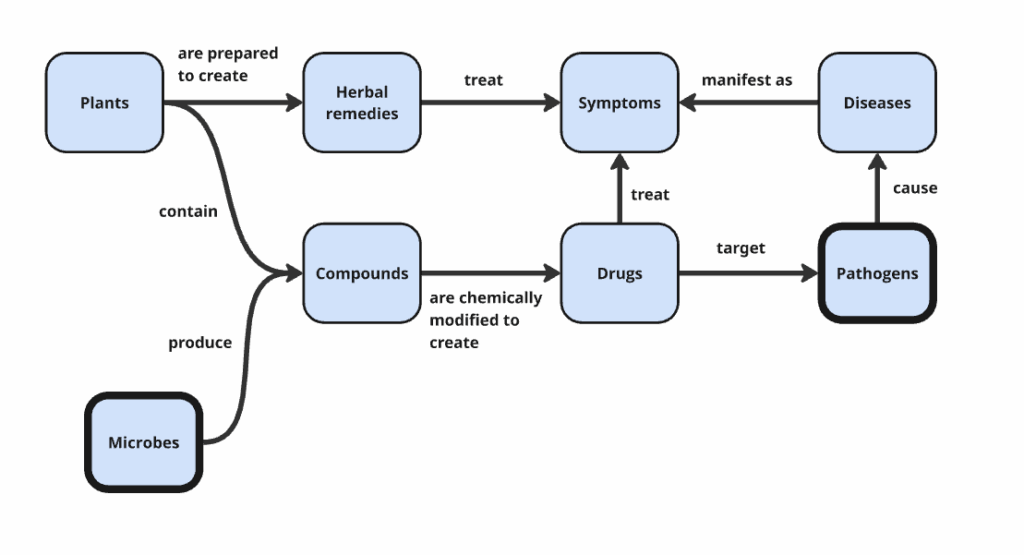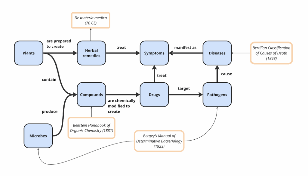 Over time, medicine developed a layered ontology, where each new class did not replace the previous one but extended it. The ontology grew to include pathogens after scientists Fritz Schaudinn and Erich Hoffmann discovered the underlying cause of syphilis was a bacterium called Treponema pallidum. We learned microbes could be found almost everywhere and some of them could kill bacteria, like penicillin, so microbes were added to our theory.