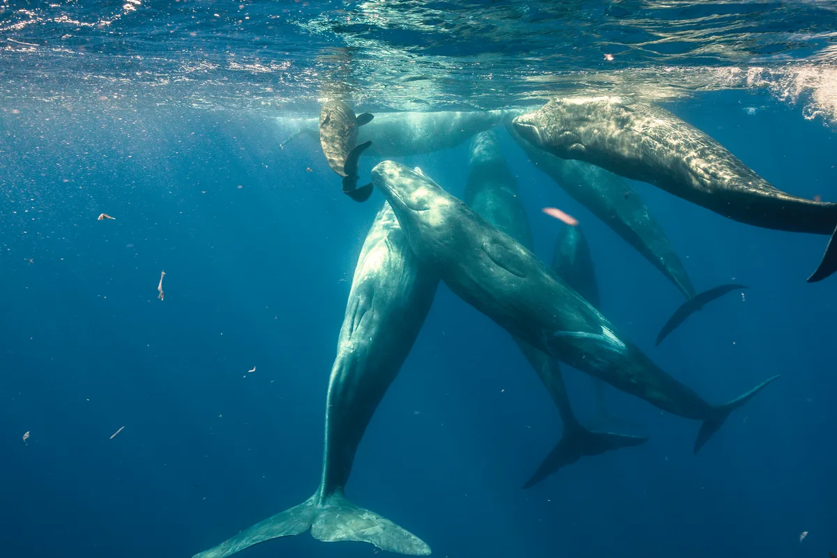 I dive down and pass right under the group, and suddenly I realise what’s going on. There’s no wounded animal here – it’s a mother giving birth. Bits of placenta are suspended in the water and I can see the calf, which must have left the womb a few seconds earlier. It’s still immobile, so the five ‘midwives’ raise it to the surface for its first breath. The mother, weak from her exertions, watches from below.