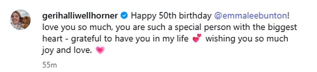 Geri Halliwell, 53, also posted: ‘Happy 50th birthday! love you so much, you are such a special person with the biggest heart – grateful to have you in my life wishing you so much joy and love.’