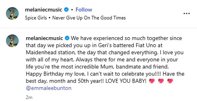 Mel C – aka Sporty Spice – shared a video montage of memories with Emma as she wrote: ‘We have experienced so much together since that day we picked you up in Geri’s battered Fiat Uno at Maidenhead station, the day that changed everything. I love you with all of my heart.