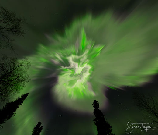 “What an incredible night of dancing, exploding and pulsating aurora!” says says photographer Sacha Layos near Fairbanks. “Every time I thought the show was done, it would ramp back up again and explode across the sky.”