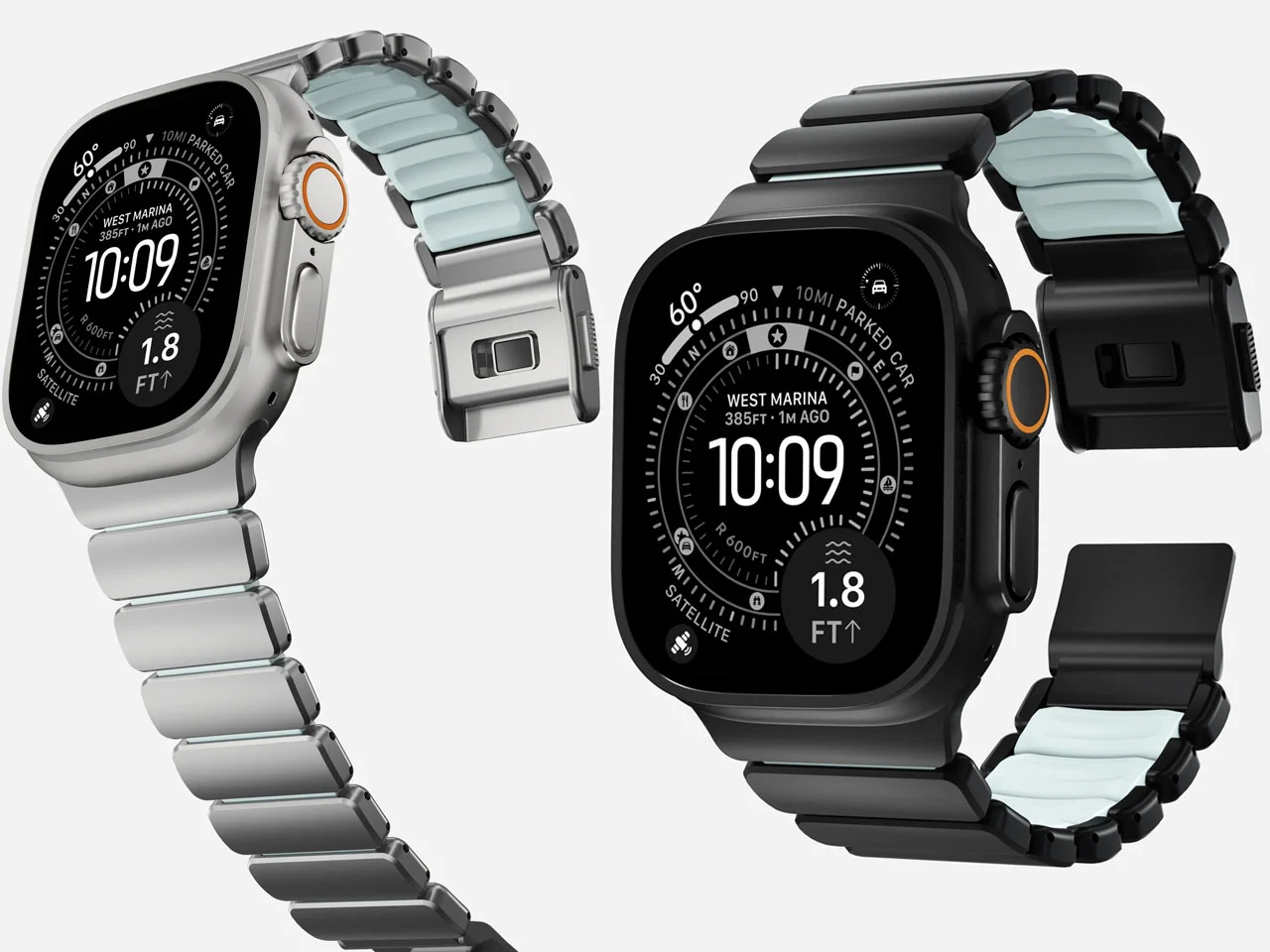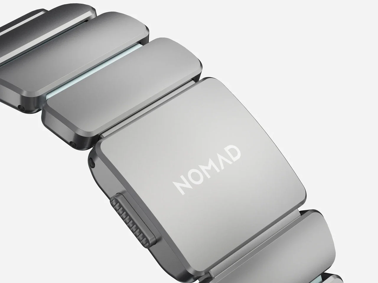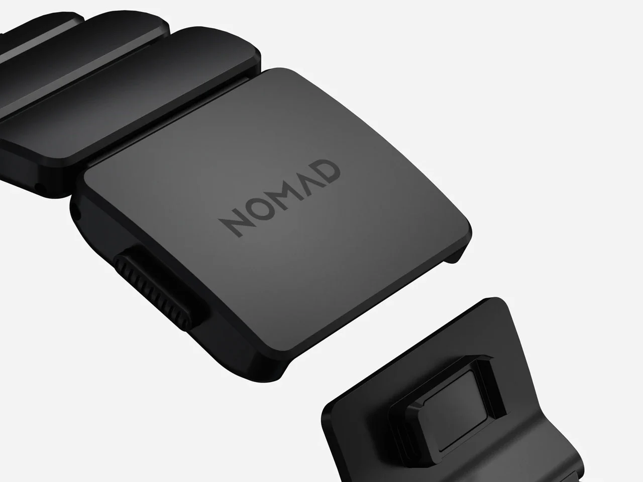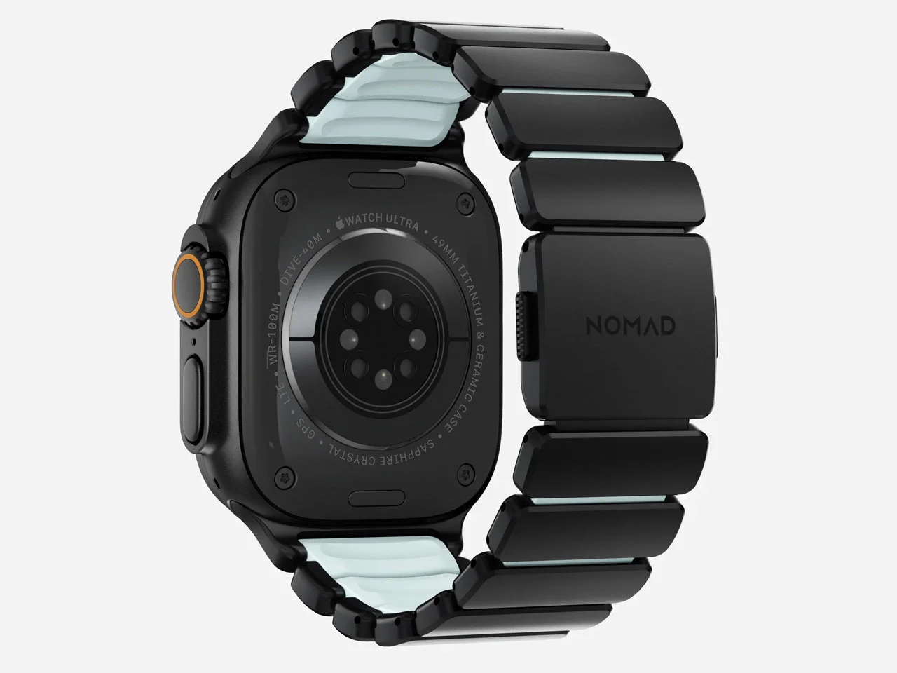 What sets the Icy Blue Glow edition apart is the photoluminescent material infused into the interior FKM links. This compound absorbs light throughout the day and emits a soft blue glow in low-light conditions. The glowing effect is more subdued in typical environments because the material sits beneath the titanium, but it still produces a cool, visual accent in the dark that distinguishes it from more conventional bands. Nomad equips this limited version with a custom magnetic clasp engineered for secure closure and corrosion resistance. The clasp remains fastened through daily movements yet opens easily when the sides of the buckle are squeezed. Users can also fine-tune the band’s fit using the included tool to remove or add links, making customization straightforward.