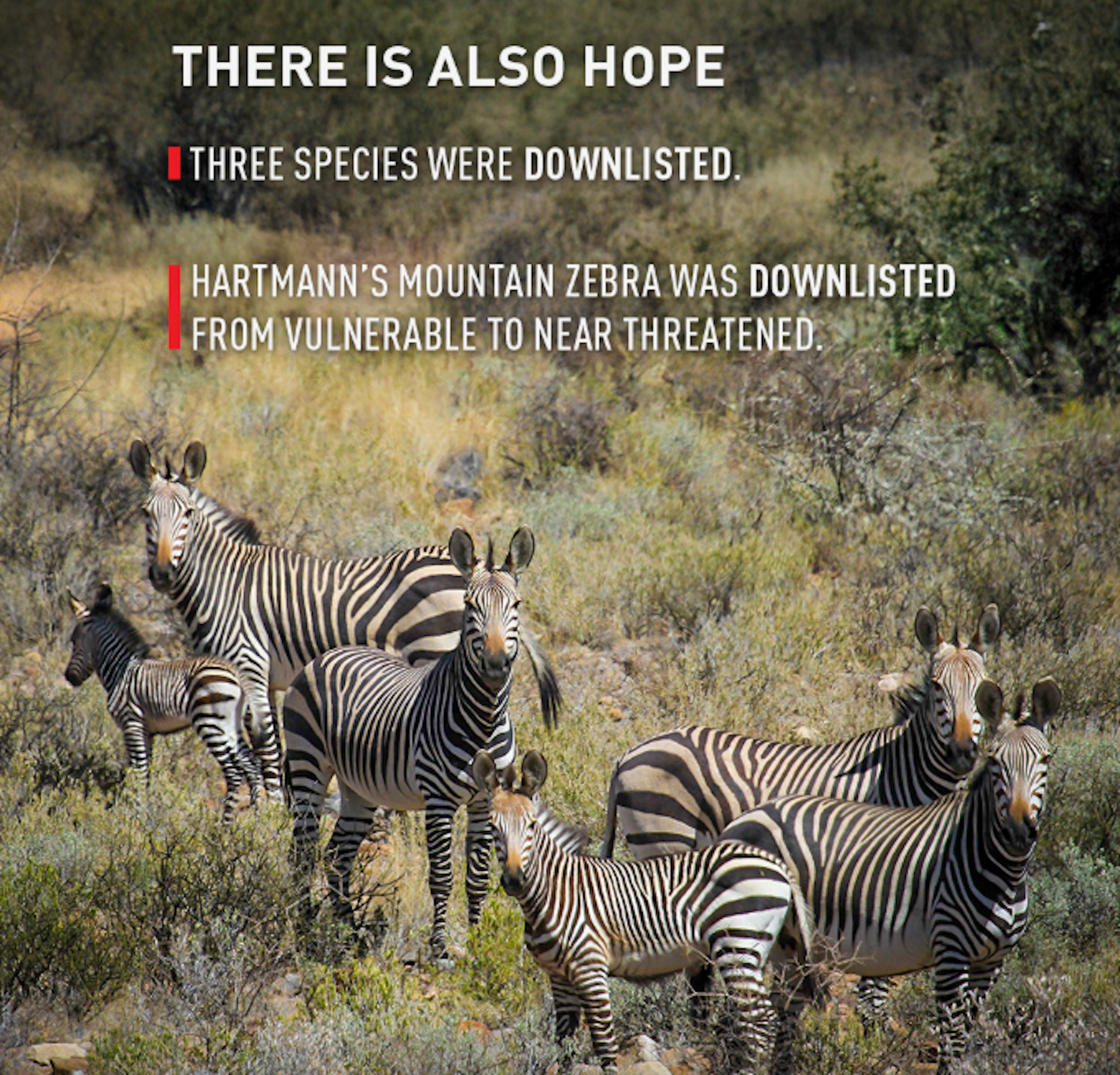 Three species improved – the roan antelope was downlisted from Endangered to Vulnerable, while the southern elephant seal and Hartmann’s mountain zebra were both moved to Least Concern.