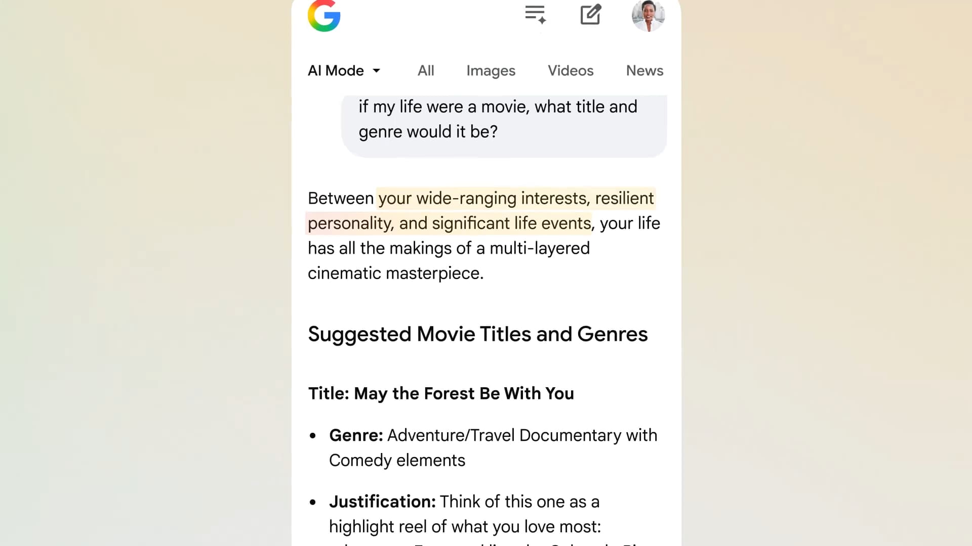 You can even ask fun questions that you never imagined searching for — like “if my life were a movie, what would the title and movie genre be,” or “describe my perfect day.”