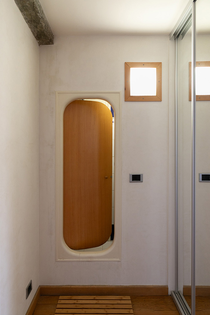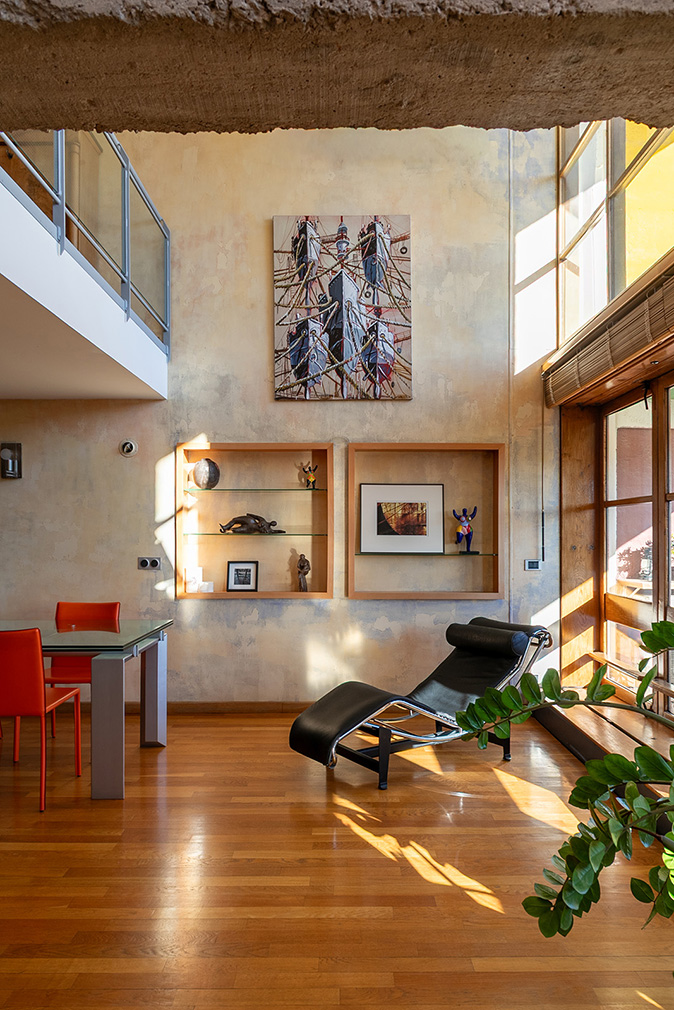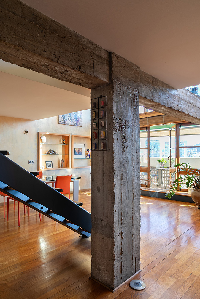 The lower level accommodates the living, dining and library areas, opening onto a doubled loggia that extends the room outward and frames expansive views across Marseille and the surrounding hills. Nearby, the kitchen retains the proportions and intent of the original scheme, designed by Charlotte Perriand and updated in the 1990s with restraint. Upstairs, a bridge-like walkway leads to the private spaces, including a primary suite, two further bedrooms and a study, all organised around light filtered through the double-height glazing. Flexible partitions allow rooms to be opened or closed as needed, maintaining the apartment’s adaptability.
