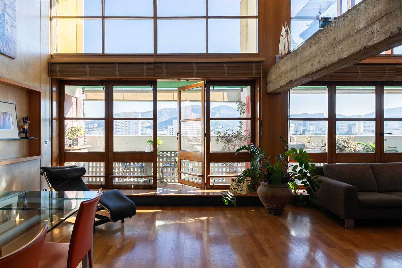 Light is the organising principle of this double Type E duplex, formed in 1966 from the union of two adjacent apartments inside Le Corbusier’s Unité d’Habitation. Set high within the concrete frame, the 200sqm interior is shaped by volume and proportion. A double-height living space draws daylight deep into the plan, where timber floors, exposed béton brut and the rhythm of the original structure establish a calm, measured atmosphere that has changed little since the building’s completion in 1952.