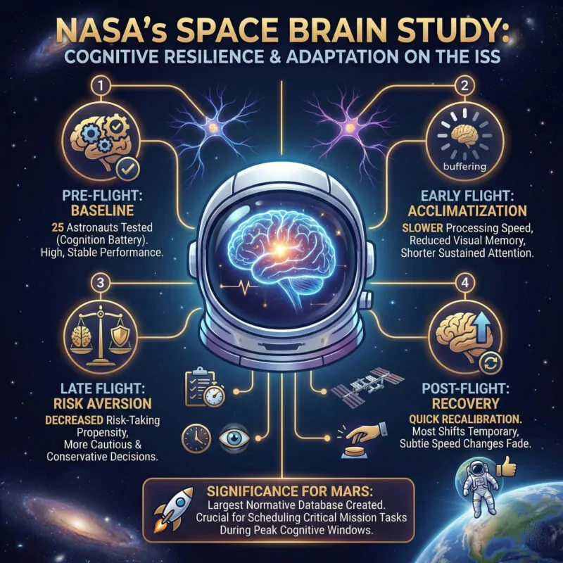Fast Recovery: Most cognitive shifts were temporary. Once back on Earth, the brain quickly recalibrates to 1G conditions, though some subtle changes in speed remained noticeable in the “early post-flight” window.