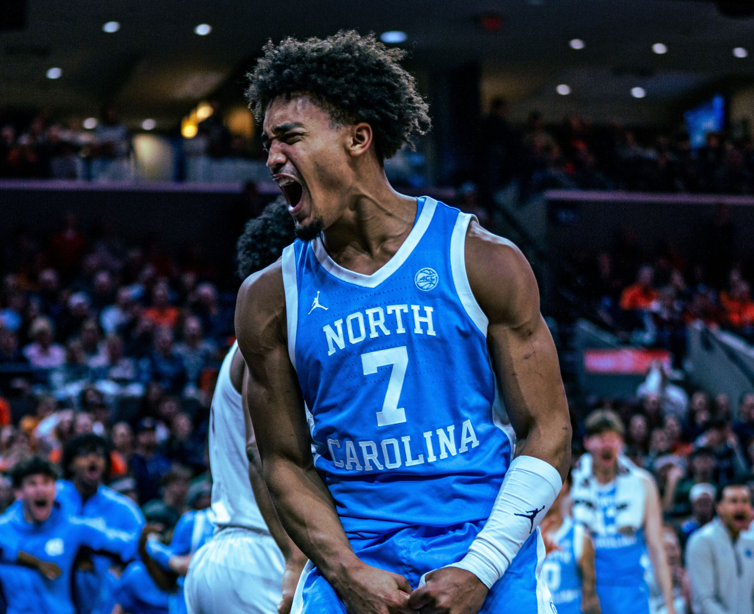 Caleb Wilson finishes a dunk during the second half of UNC’s game vs. Virginia. The Tar Heels fast-break offense helped Carolina pull ahead and keep its lead against the Cavaliers. (Photo by Chance Bragg/Chapel Hill Media Group.)
