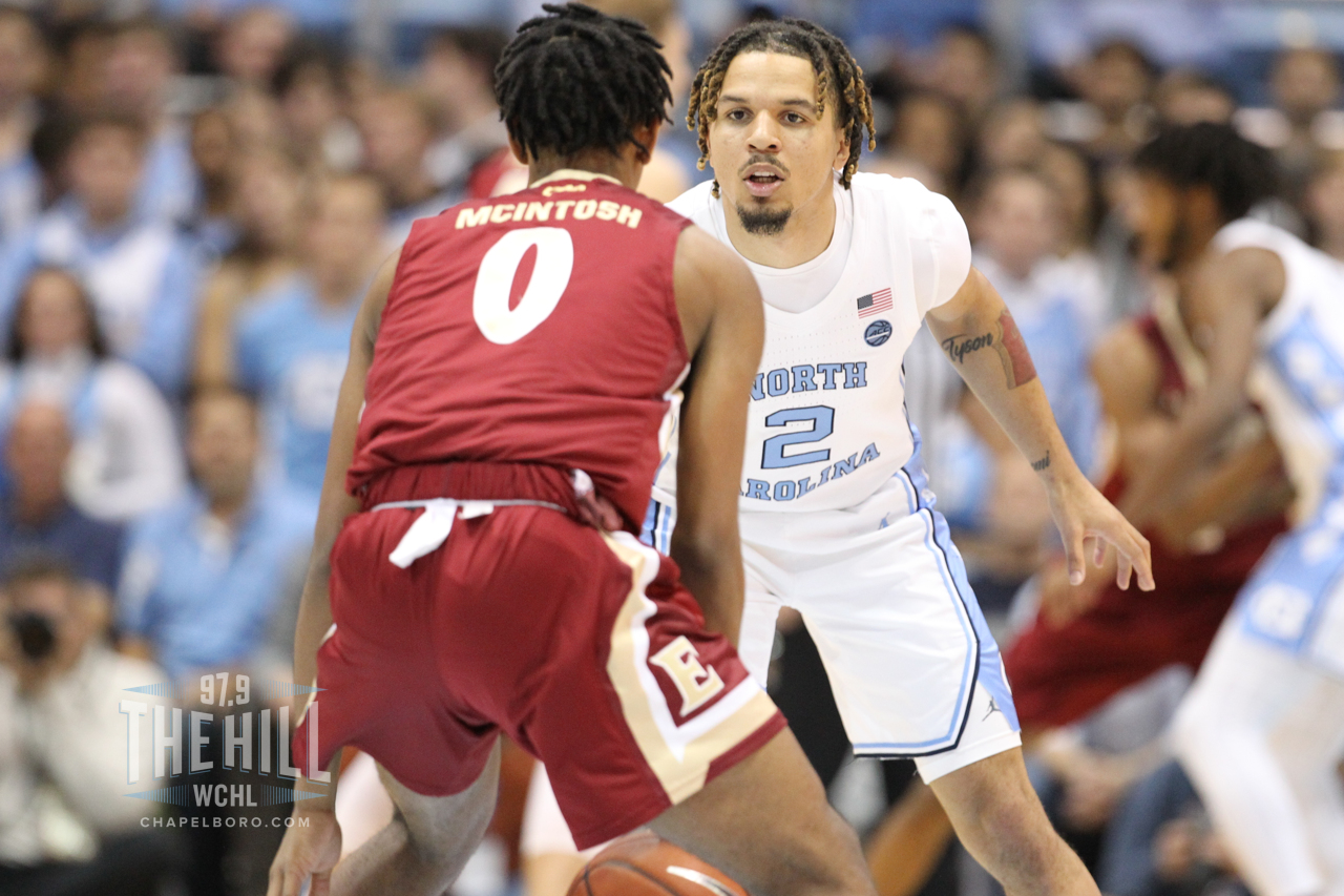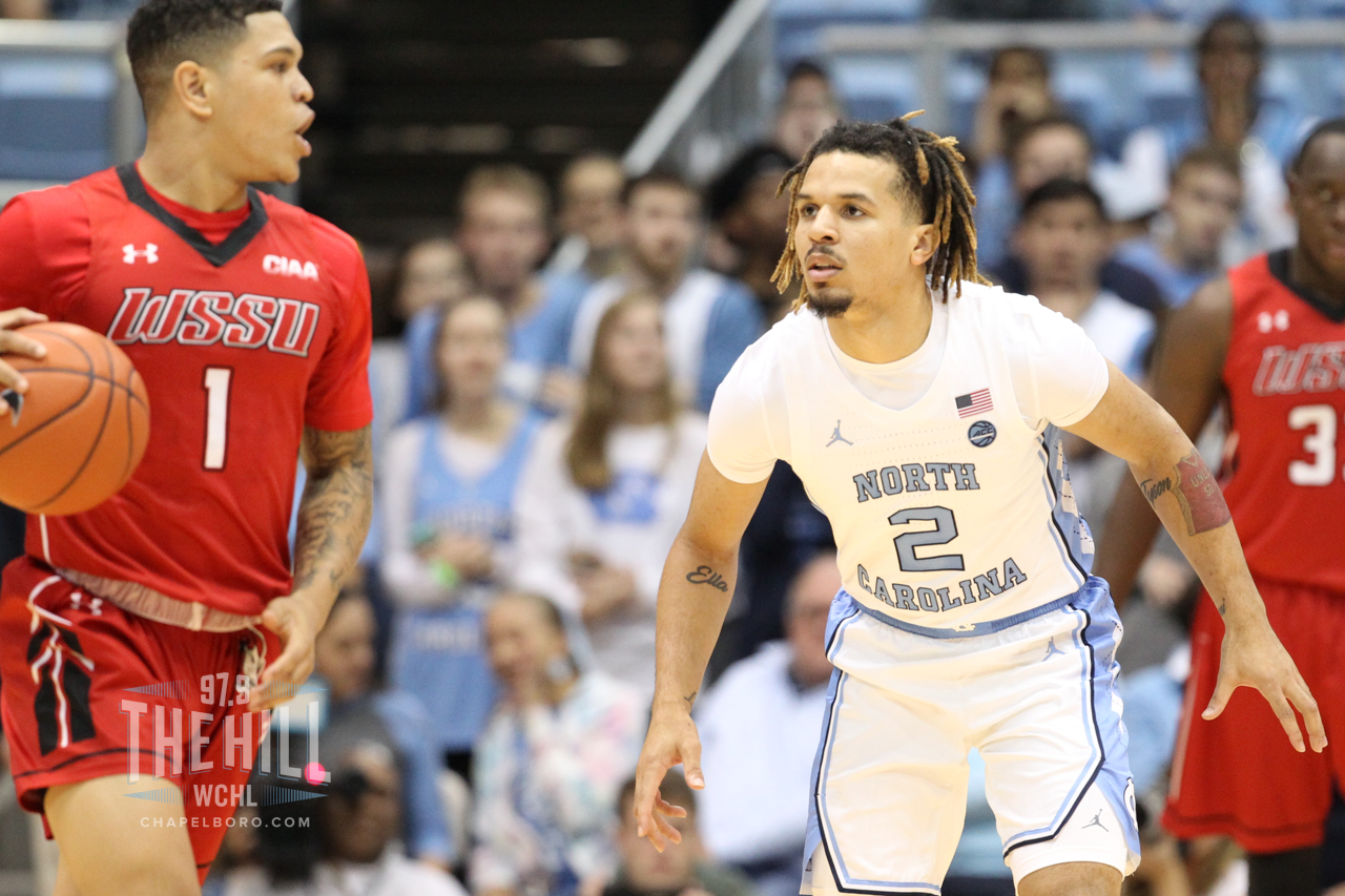 Stevenson, a local player who’s become a favorite after transferring from Alabama, seems happy to be playing anywhere — especially how he came through in Charlottesville, hitting 6-of-9 from the floor that included two three-pointers and a critical “and one” layup that gave UNC the lead for good. His quick decision to draw a charge in the lane against ‘Hoos star Thijs De Ridder was also critical to helping seal the team’s 16th win.