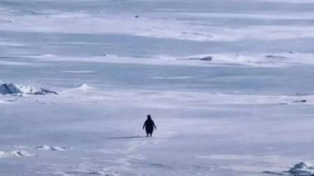 In a haunting scene, an Adélie penguin suddenly abandons its colony, heading toward a distant mountain range roughly 70km inland.