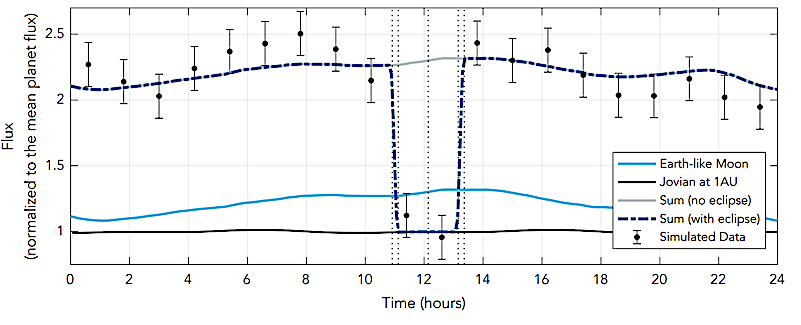 Lunar–eclipse model for an Earth–like moon (light blue) and a Jupiter–sized planet (black), where the Earth–like moon is ∼1.2× brighter (on average) than the giant planet. Blended time–series photometry with (dark–blue dash–dotted) and without (light gray) the lunar eclipse is shown. Both light curves include measured rotational variability for Earth and Jupiter in the near IR. The deep eclipse near 12 h corresponds to a > 50% drop in the flux (i.e., a > 10−10 decrement). In this example the Earth–like moon follows an Io–like orbit (1.8 d, edge-on), yielding a few–hour eclipse duration at 1.8 d cadence. Notably, the moon’s variability dominates over the planet’s. The simulated data (black error bars) assumes the eclipse is detected with an SNR = 9.1 as discussed in section 3 for a Jovian hosting a earth-like moon at 5 pc. The simulated points have a cadence of 1.2 hr, corresponding to an SNR of 7.8. — astro-ph.EP