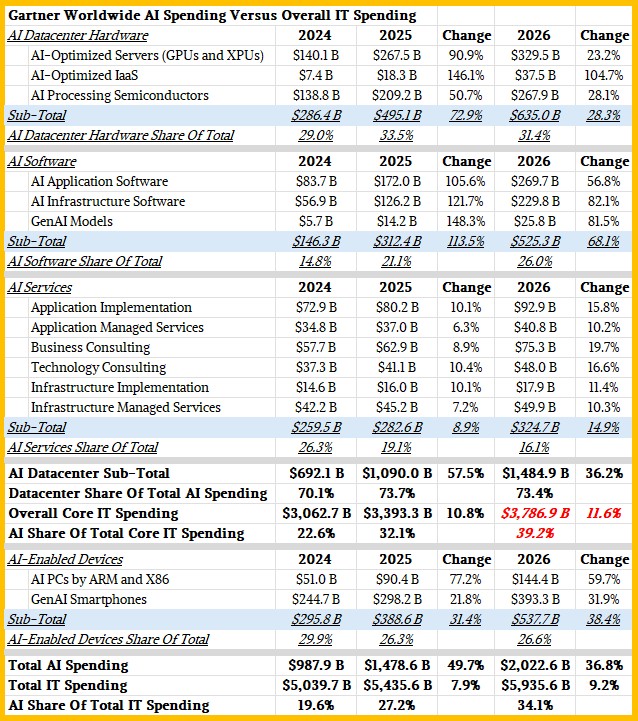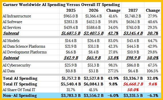 I was mixing and matching data from IDC and Gartner by necessity in that table, but in October 2025 Gartner put out a revised forecast for overall IT spending worldwide, and now we can compare and contrast these within the same organization and, presumably, get a much more accurate sense of how AI spending is driving IT consumption overall. Take a look: