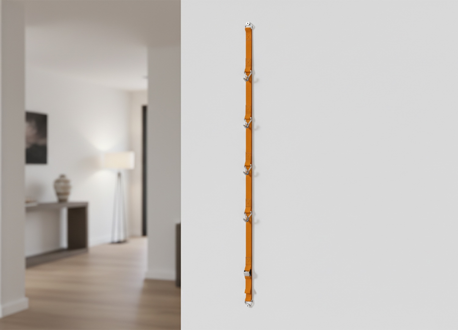 Ratchet straps already contain everything needed for multiple uses – hooks, loops, and a tensioning system – making them almost completely ready-made. Strap translates this industrial logic into a modular wall-mounted coat rack. Each unit consists of an orange nylon webbing strap, metal hooks for hanging objects, a self-locking buckle to adjust tension, and triangular metal rings that connect the system to the wall. These rings hook onto wall-mounted pins or screws, fixing the strap at the top and bottom while keeping it under tension.