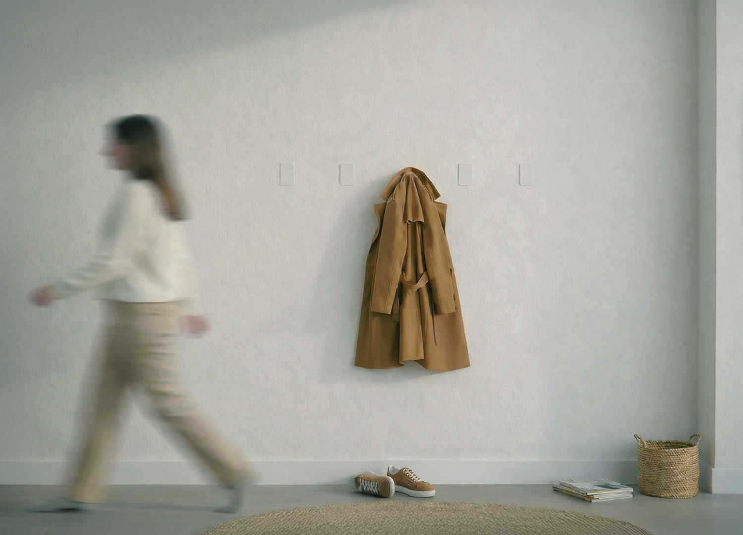Designed to disappear when not in use, VELTO reveals itself only when needed. It challenges the idea that design must always be visible to have value, proposing instead discretion, restraint, and even absence as legitimate qualities. In its resting state, it appears as a small metal element integrated into the wall. With a single push, the structure unfolds, becoming a hook capable of holding coats, bags, and accessories.