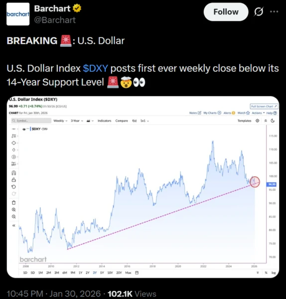 The US Dollar Index, which tracks the dollar’s performance against a basket of six major currencies, recently posted a weekly close below a long-term support level that had held for more than a decade, according to data from Barchart. The move could signal further downside risk if the breakdown is sustained.