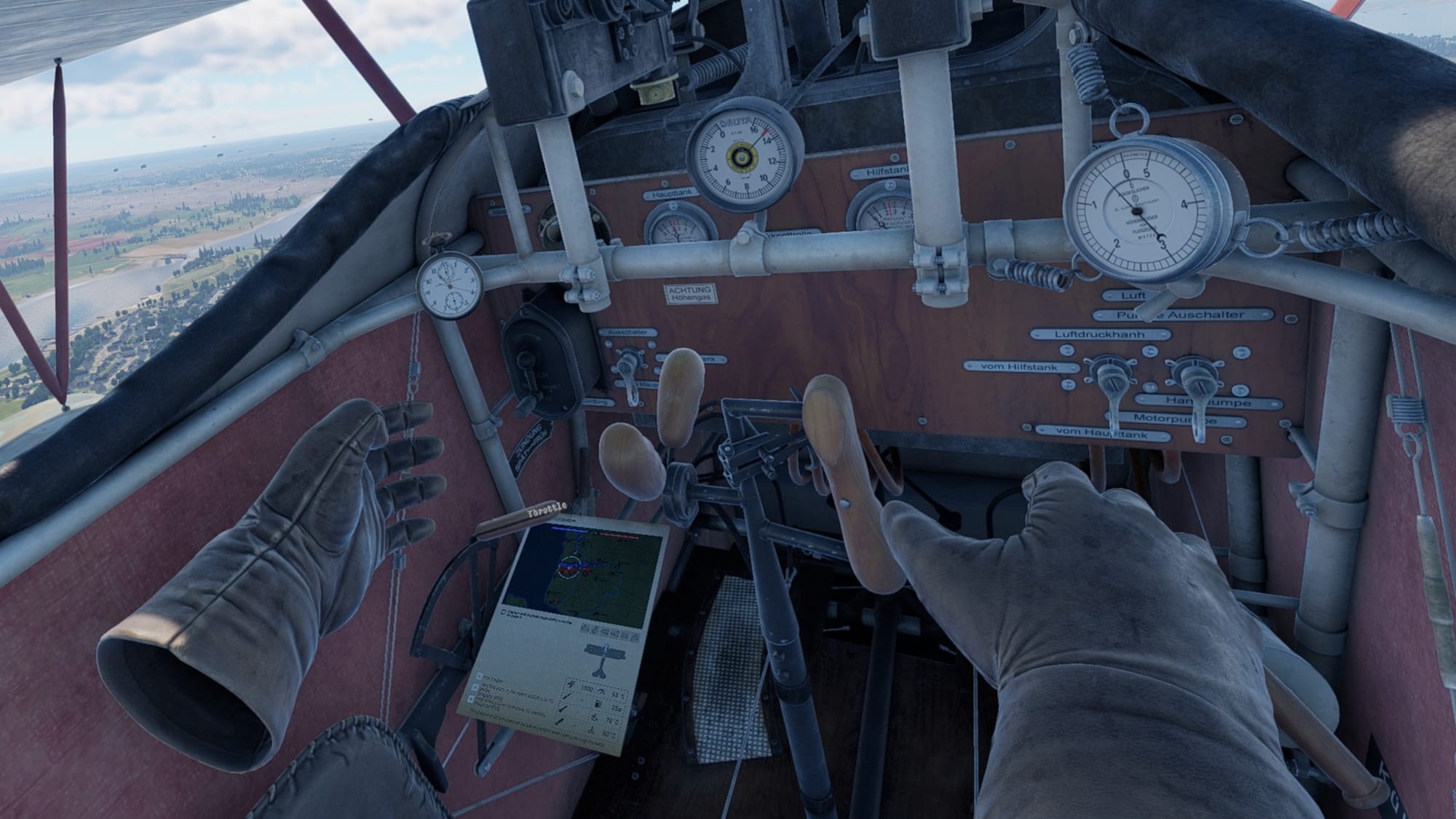I had only two issues with Aces of Thunder. The first is a natural consequence of enjoying what there is – which is to say I wanted more of everything – WWI planes and maps especially. But my main bugbear was the sparse and often unhelpful presentation away from the meat and potatoes of the main game. There really isn’t much assistance to speak of at all – no tooltips, no tutorial – and the game starts without fanfare and dumps you unceremoniously into the middle of a makeshift airfield, with only distant birdsong and some old gramophone dirge to stir you to action. That action in common with many VR games is to make your selections from an unconvincing clipboard that’s been surgically attached to your flying glove. The problem is that navigating the various menus with said glove is clumsy in the extreme. It’s like trying to operate a phone with a sausage. Sure you get used to it – because you have to – and if you just want to pick a plane and take to the skies you can just about accept the lack of a more precise pointer system, but for anything more than that – such as tweaking the graphical settings, or God forbid, reassigning controls to the various axes of your HOTAS and rudder setup, well, prepare yourself for an exercise in fist-shaking frustration. And don’t think it’s any easier reassigning controls in the flatscreen mode either, because it most definitely isn’t.