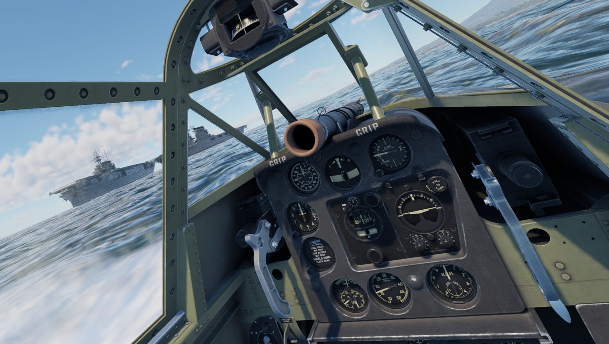 The other difference is just how integral VR is to Aces of Thunder. That may seem an obvious thing to point out, but with a flatscreen version that offers crossplay, Gaijin could so easily have undermined its own efforts by including a superfluous or seemingly harmless HUD element or camera view that favored one group of players over another. Take War Thunder; it has perfectly serviceable VR functionality, sure, but it’s not in the slightest bit necessary or helpful. Here though your only view is from the cockpit. There are no third-person views or chase cameras, no floating icons or voiceover cues to suggest your plane is about to spectacularly break apart, or indeed hardly anything that would constitute any element of a gaming HUD – aside from a map that sits on your lap and I really had to lean into to get anything from. In short, all your feedback about your mission, the state of your aircraft and any potential threats all must come from the timely and judicious use of your Mk 1 eyes and ears. The challenge of the game and why it is so compulsively immersive is because, yes, you have to master the controls, but simultaneous to that is the need to be as aware of what your cockpit instrumentation is telling you as much as the creaking of the airframe or a violently oscillating wing before it snaps off and sends you spinning into the briny below.