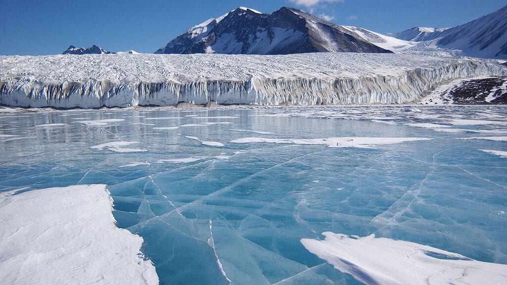 In Antarctic lakes such as Lake Fryxell, fresh water freezes over briny liquid water. New research suggests that the liquid seawater during “snowball Earth” was up to 4 times saltier than modern ocean water, meaning it could reach much lower temperatures before freezing. Credit: Joe Mastroianni, National Science Foundation/Wikimedia Commons