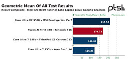 When it comes to gaming, the only games in which the Xe3 iGPU was bested by the AMD competition were Counterstrike 2, running at 1920×1200, and Quake II RTX. In every other game, the Intel Arc B390 beat both the AMD competition and the Intel Core Ultra 7 155H and Core Ultra 7 258V significantly. Depending on the game and in-game settings, the Arc B390 was anywhere between 15% and upwards of 50%. Hitman 3 was a particularly impressive outlier, with the B390 managing to get over 50% more FPS than the nearest competitor and 64% more FPS than the Radeon 890M at 1920×1200 and low settings, with similar gains at medium quality settings, and a slightly less impressive performance improvement when bumping up to ultra settings.