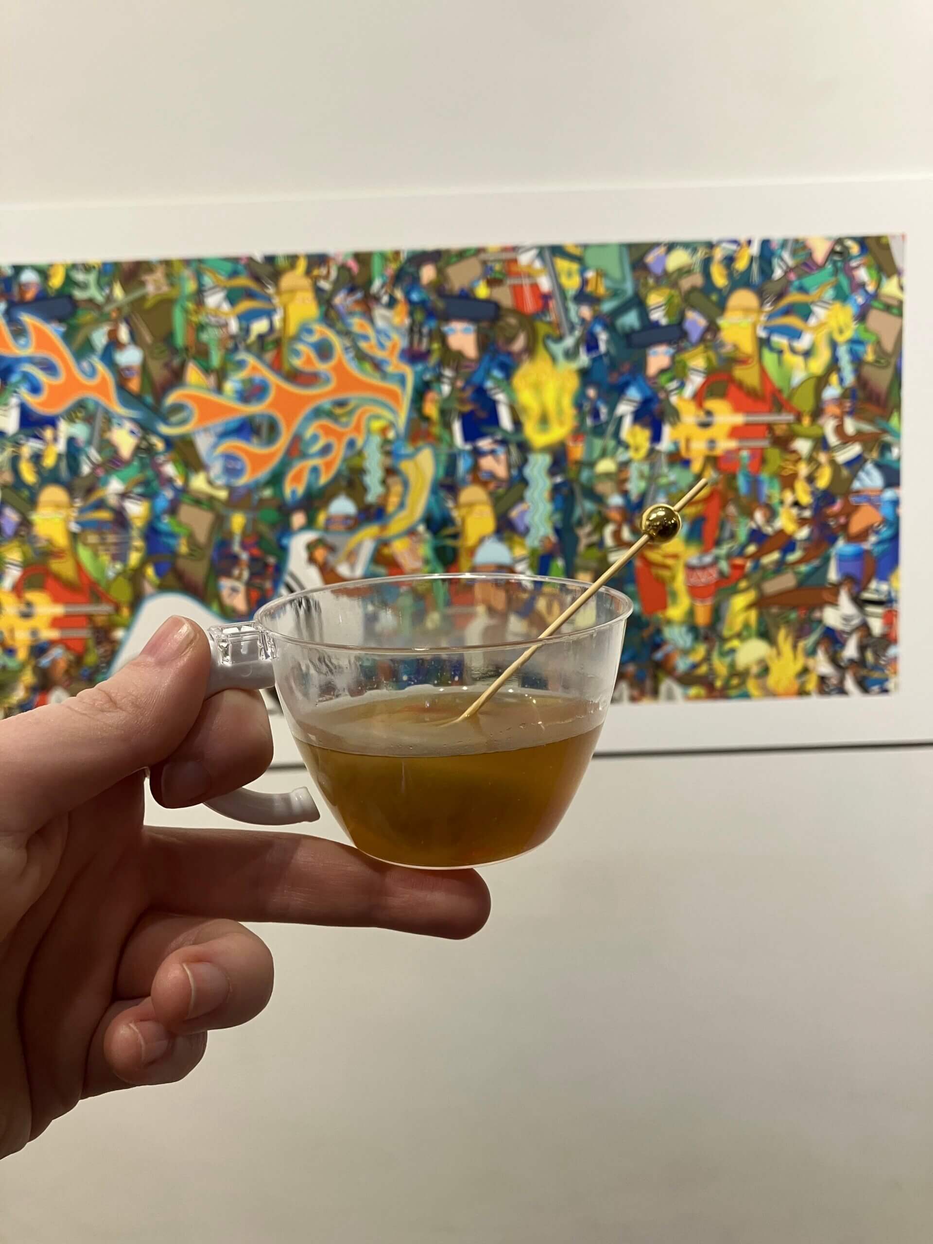 But I have to admit: The art show was kind of cool. It nailed its aesthetic, embracing the absurdity and surrealism of a moment in which a historic, grandmotherly brand like Manischewitz would be running an aura farming event, tonally a perfect fit for an irony-pilled era. Yet it also took itself seriously in the right ways; it was, ultimately, an actual art show with Jewish artists’ work in a neighborhood with deep Jewish roots, serving historic Jewish food. It felt genuine and rooted even as it was irreverent. Every detail was thoughtful. The drinks were actually good. The soup was exactly the same as ever.