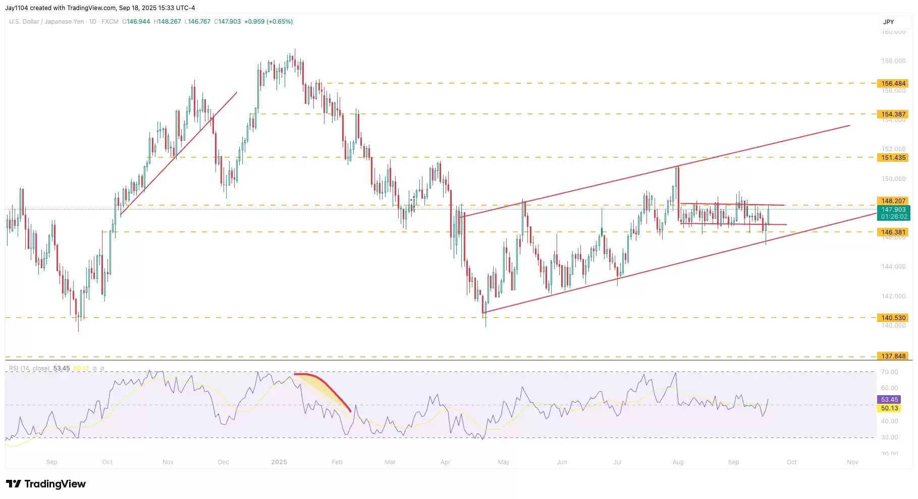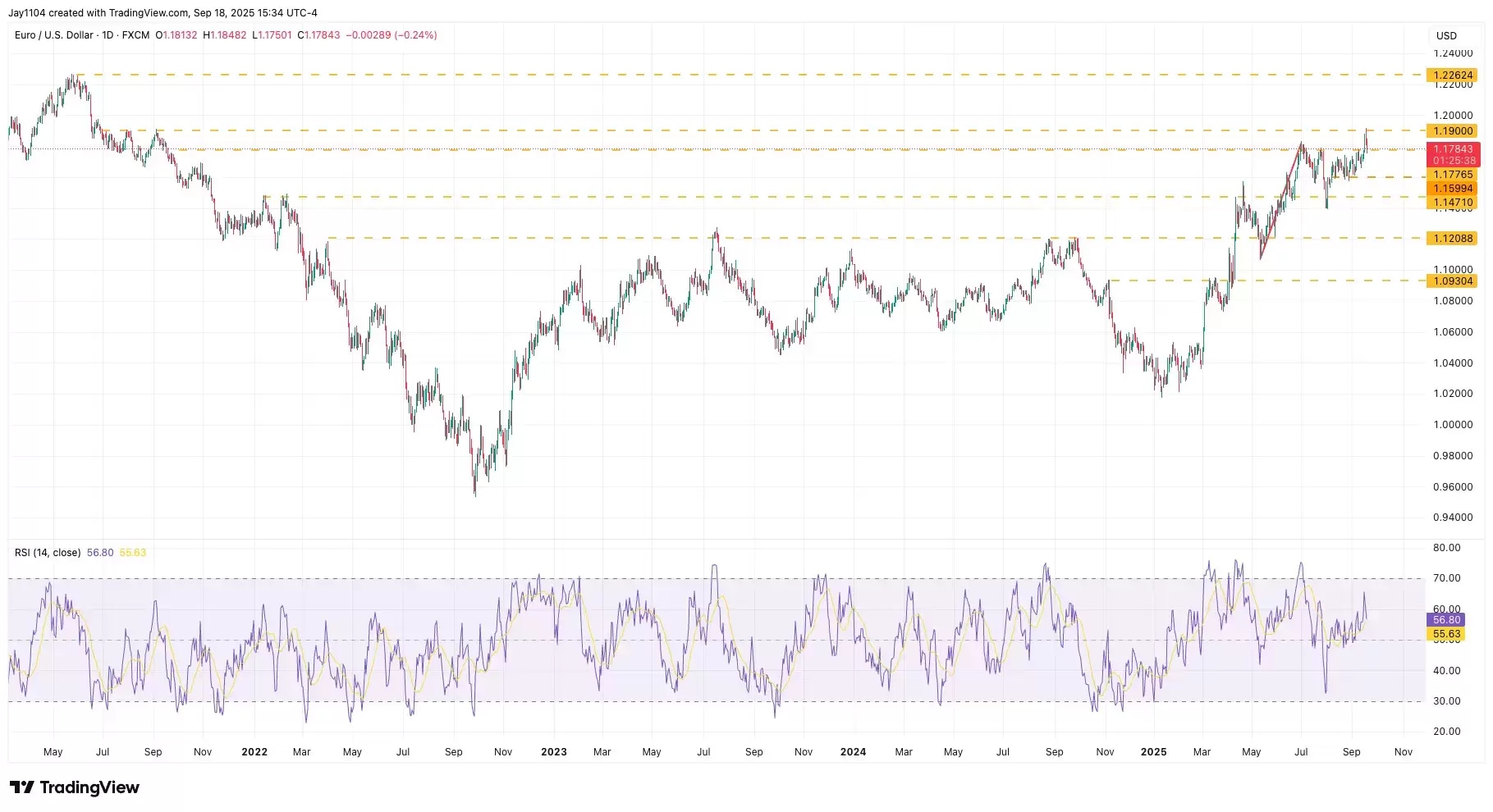 If EUR/USD can break through $1.19, it has a relatively clear path higher, with little resistance until around $1.226. However, if the attempted breakout fails and the pair cannot move above $1.19, the euro might weaken against the dollar, potentially slipping back towards support at $1.16.