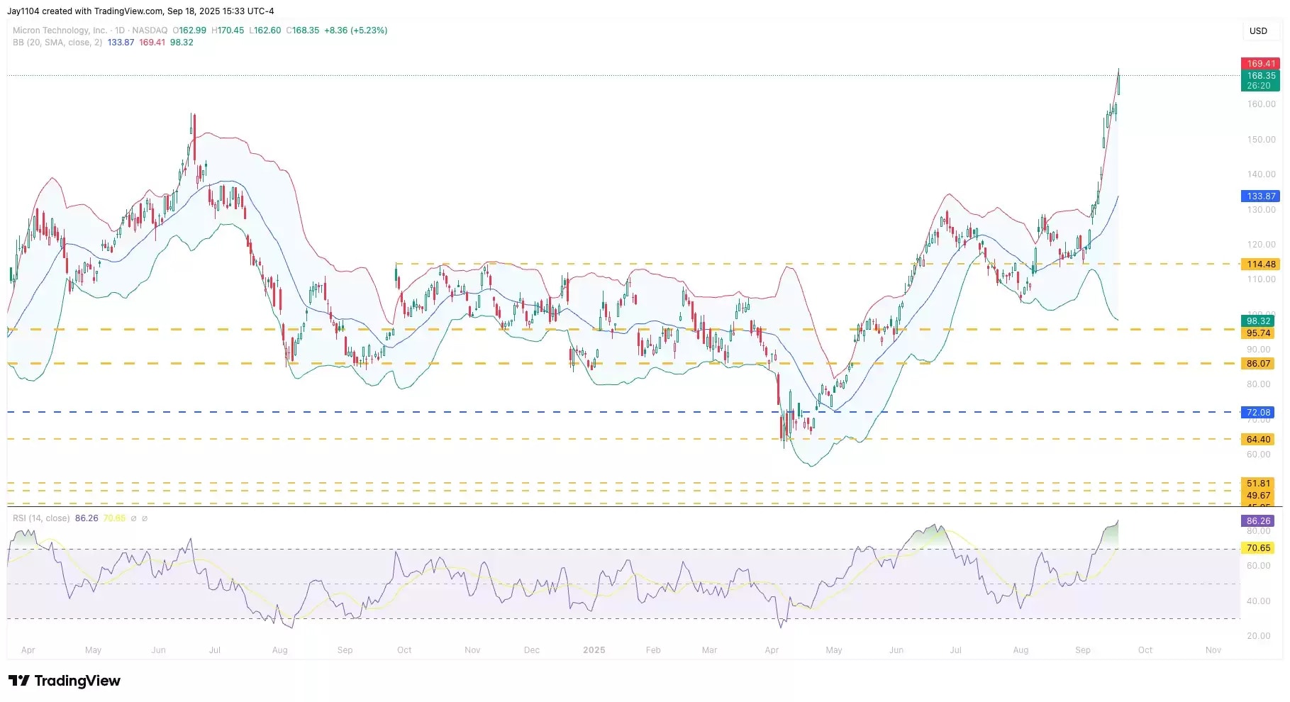 Implied volatility is likely to be well over 100% for at-the-money options expiring on 26 September. Positioning appears to be very bullish and, given Micron stock’s strong run since late August (it’s up about 40% in three weeks), the shares unsurprisingly find themselves overbought heading into Tuesday’s results, with the relative strength index (RSI) above 86 and the share price trading at its upper Bollinger Band.