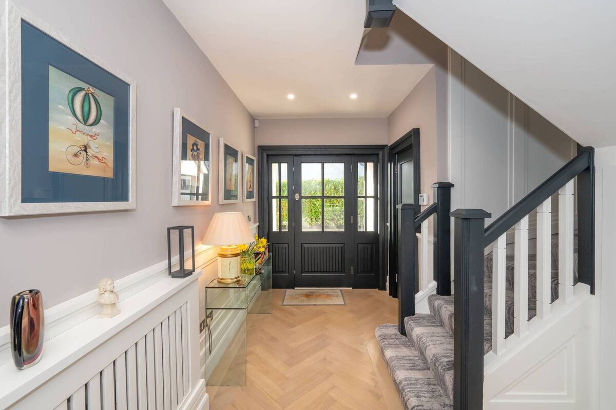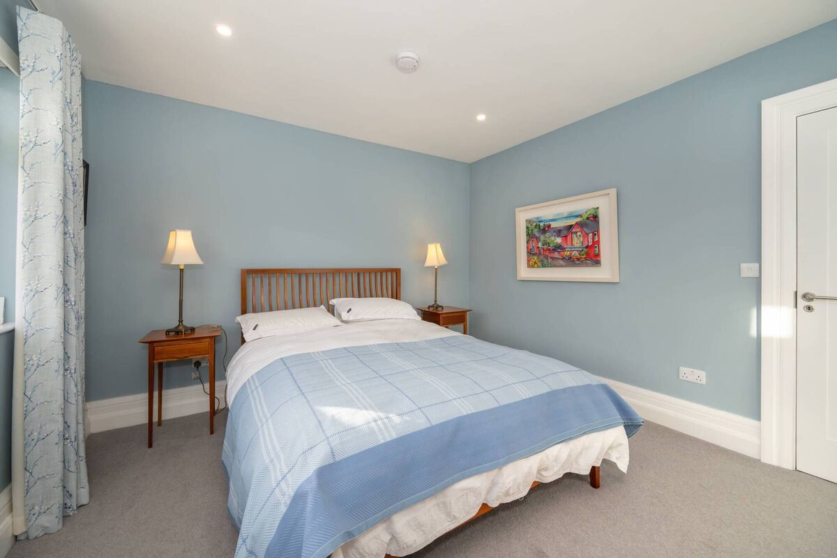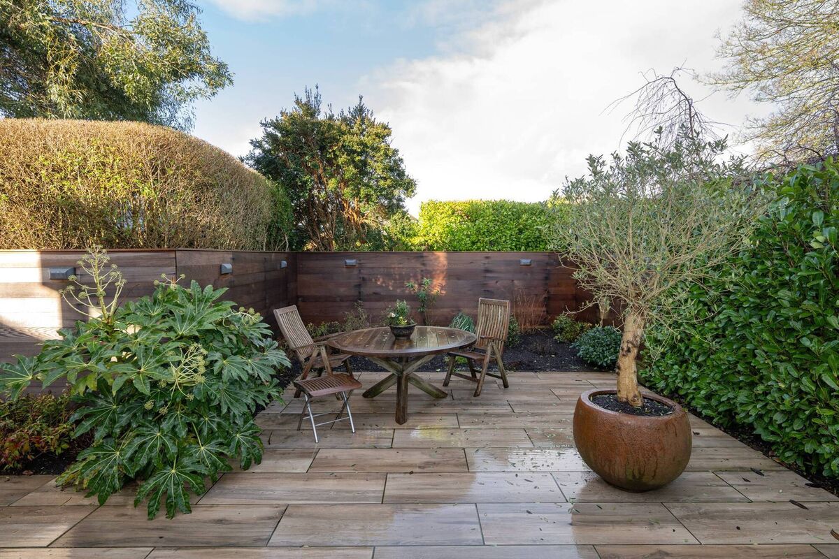 The front patio has the better aspect and mature planting — including a lofty willow tree and apple blossom — that screen it from passersby; the rear patio is fully enclosed and feels like a natural extension of the indoors.