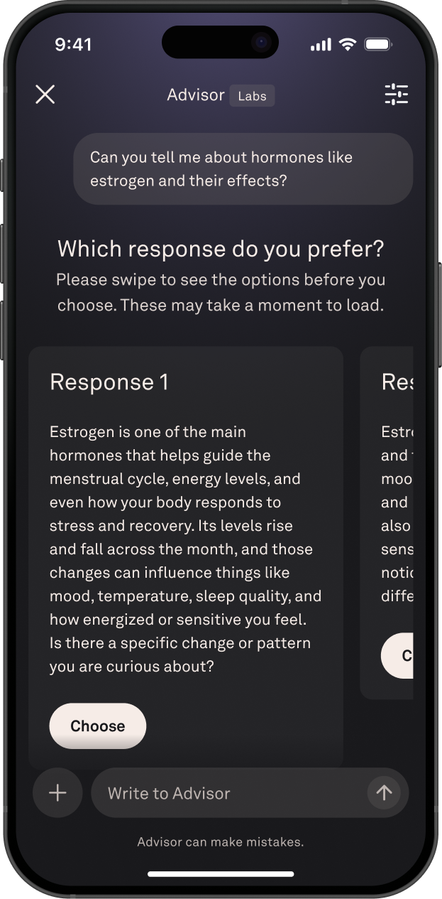 When members ask Advisor a women’s health question, it prompts the new model to reference its curated body of women’s health research and knowledge sources, while also analyzing relevant biometric signals and longitudinal trends across sleep, activity, cycle and pregnancy data, stress, and more. It is intentionally tuned to be non-dismissive, reassuring, and emotionally supportive, helping women feel seen and equipped to have more informed and confident conversations with their providers.