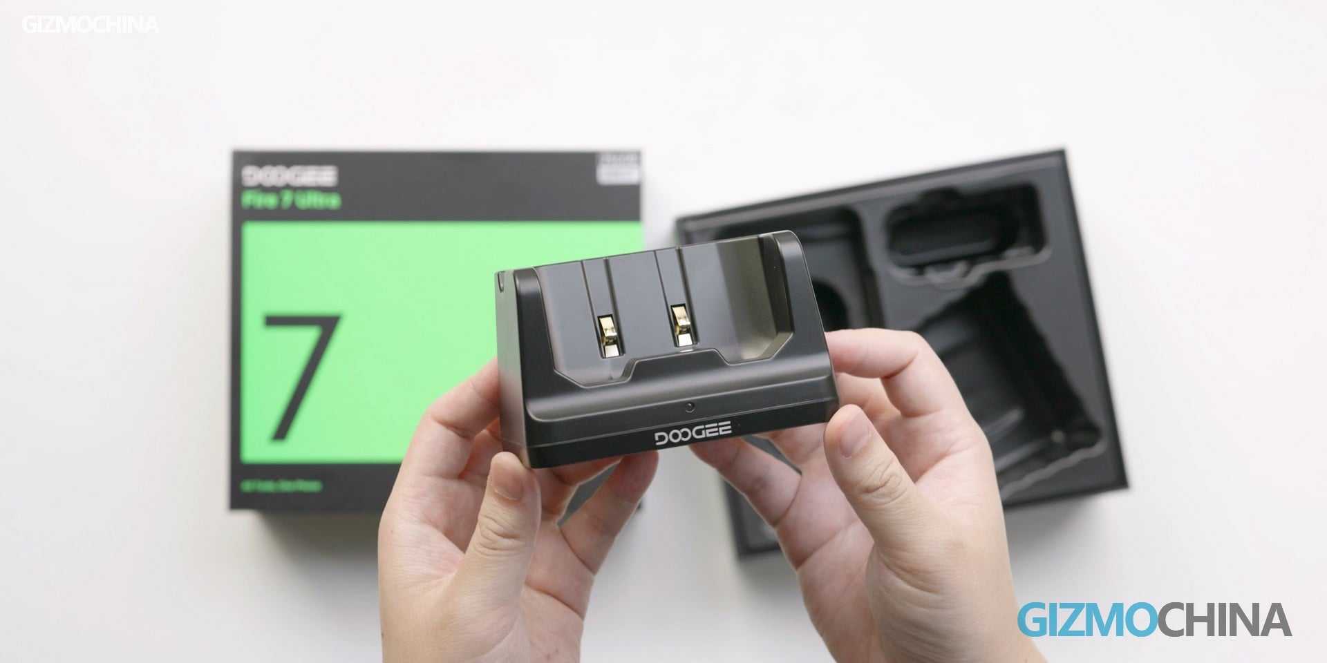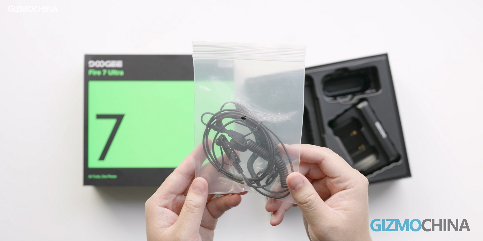 The Fire 7 Ultra comes in a much larger box, mainly because it includes more accessories. In addition to the usual manuals, charger, and cable, you also get a desktop charging base and a walkie-talkie headset. See those two contacts on the charging base? Through them, the Fire 7 Ultra can be charged at 10W.