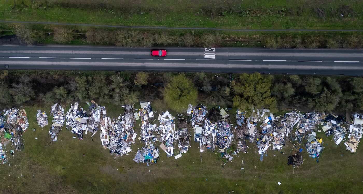 Aerial photo of dumped trash and waste along roadside in Hertfordshire near St Albans, England – SWNS