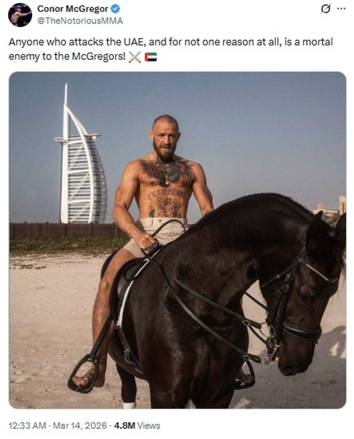 “Anyone who attacks the UAE, and for not one reason at all, is a mortal enemy to the McGregors,” wrote McGregor on X.