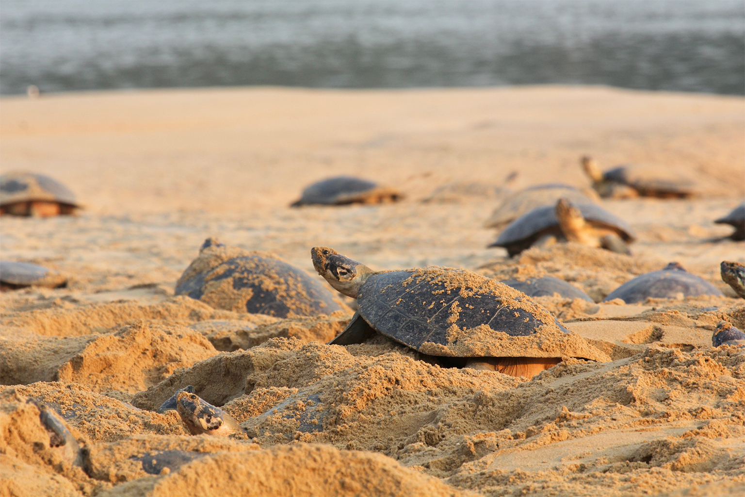 They spend around a month preparing to lay their eggs by regularly exposing their massive bodies, measuring about 90 centimeters (35 inches) and weighing 65 kilograms (143 pounds), to the sun’s heat. Then at night, groups of up to 1,000 females start leaving the water to lay their eggs in large holes in the Tabuleiro’s sands.