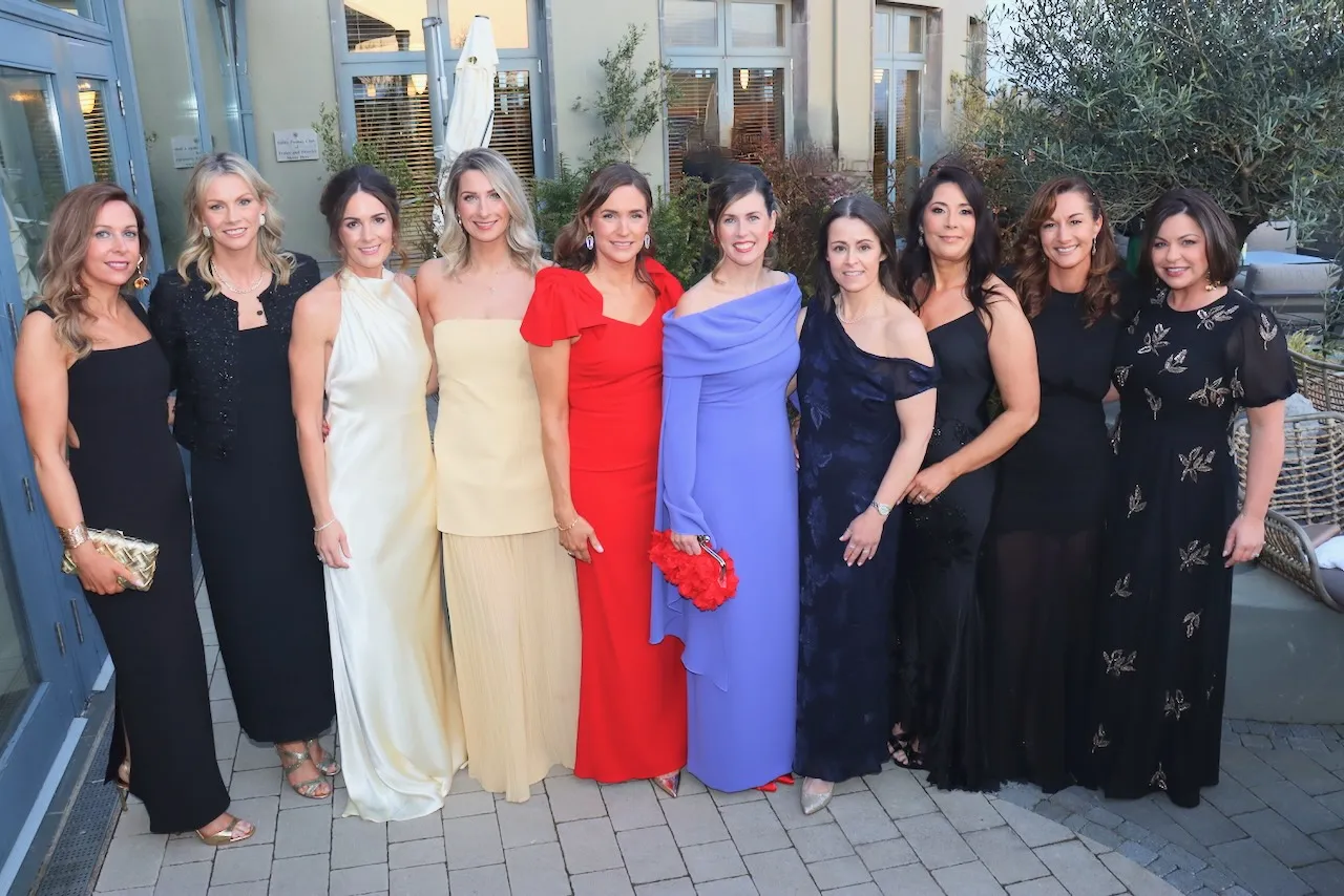 Jennifer Falvey, Alison O’Keeffe, Rachel Duran, Ashley Tobin, Denise Teahon, Elaine McCarthy, Marguerite Rolls, Riain Hallinan, Aoileann de Hora and Veronica Kelly at the Kerry Arts Ball in Ballyroe Lodge on Saturday night. Photo by Dermot Crean
