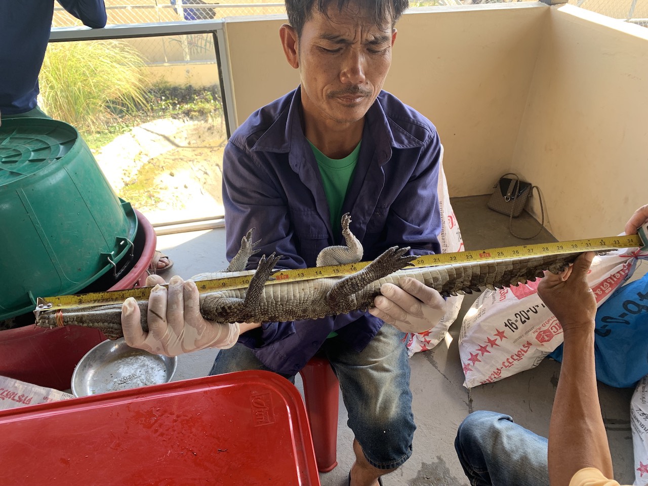 Village conservation team member measures a young Siamaese crocodile to monitor growth. Photo courtesy WCS Laos.