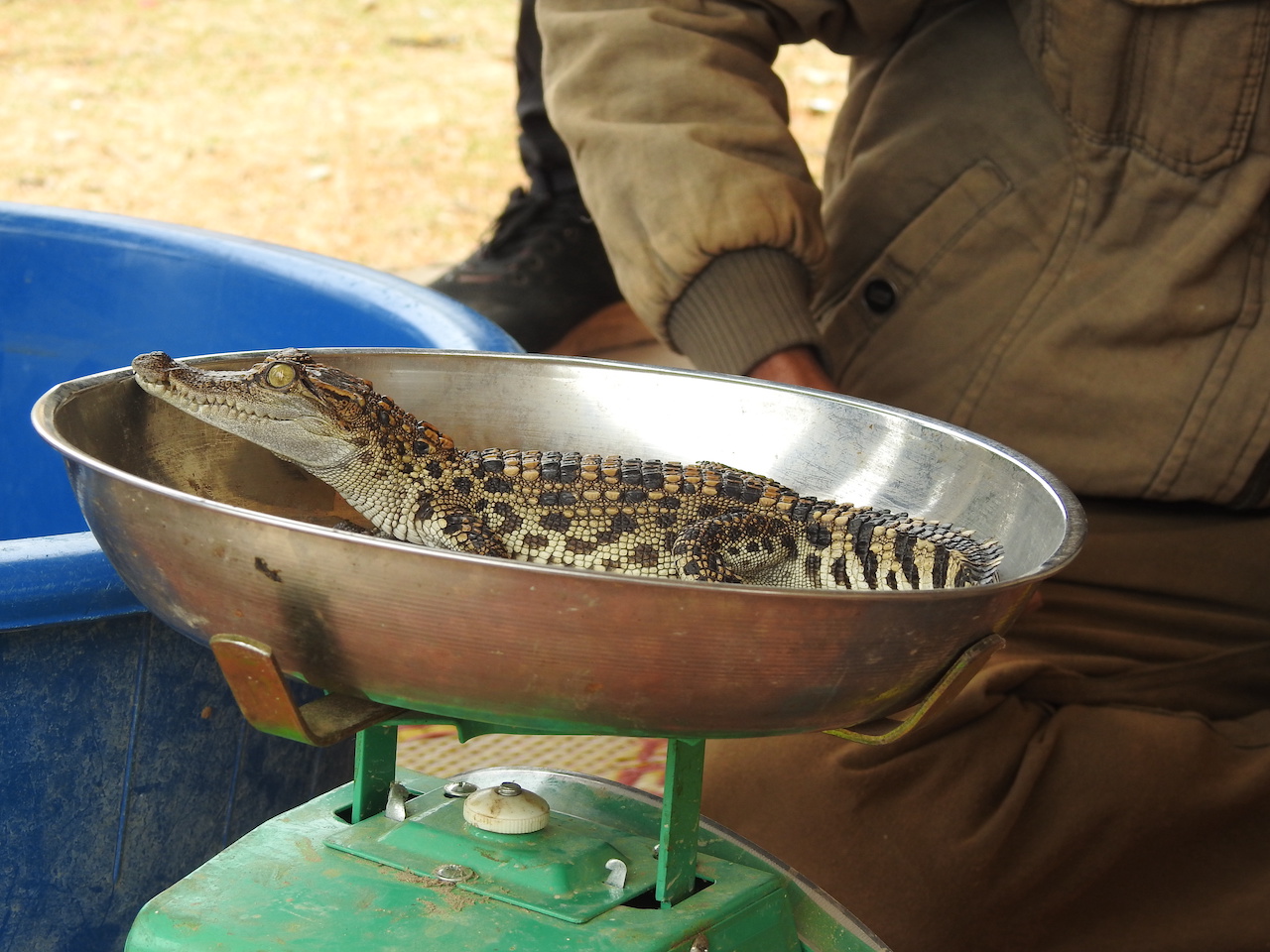 A juvenile Siamese crocodile weighs in before release. Photo courtesy of WCS Laos