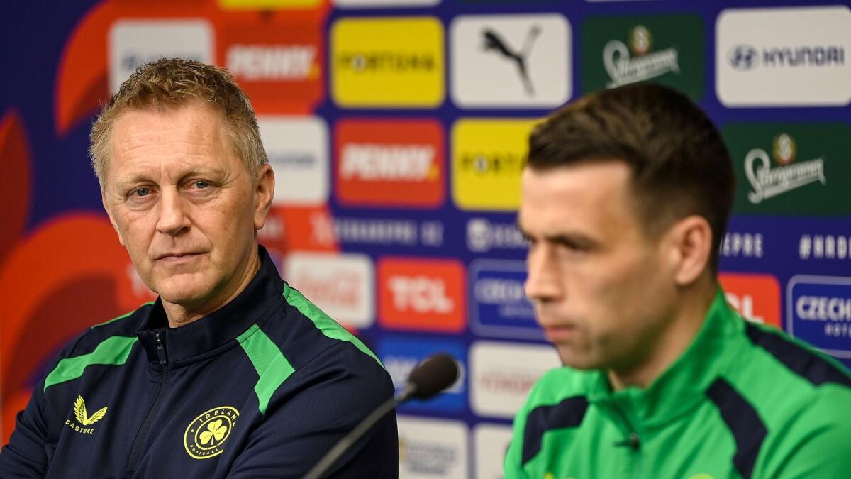 Republic of Ireland head coach Heimir Hallgrimsson and Seamus Coleman during a media conference at the Fortuna Arena in Prague, Czechia. Photo: Stephen McCarthy/Sportsfile (courtesy of FAI).