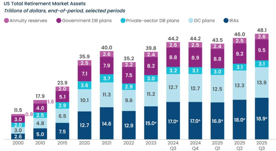 The US retirement market reached a record $48.1 trillion in financial assets on September 30, 2025, according to a report by the Investment Company Institute (ICI).