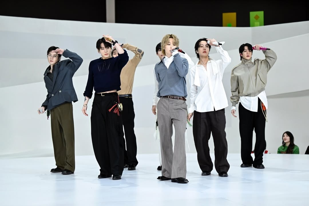 BTS entered along the museum’s iconic spiral ramp before performing on the central stage. Holding handheld microphones, they delivered a live performance paired with fluid choreography, creating a stage that resembled a work of art.