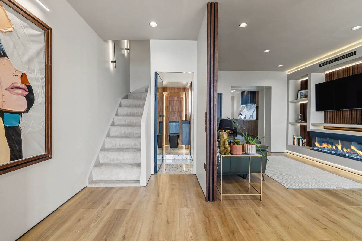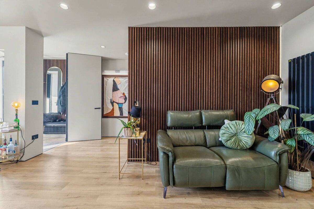 A discreet bar, concealed behind cabinetry downstairs, adds an element of ‘speakeasy’ glamour and mature charm to the living room.