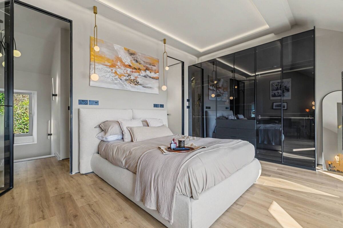 Here there are three bedrooms: two on the middle floor, while the main bedroom, with its clear glass door, en suite and walk-in wardrobe, takes up the entire top floor.