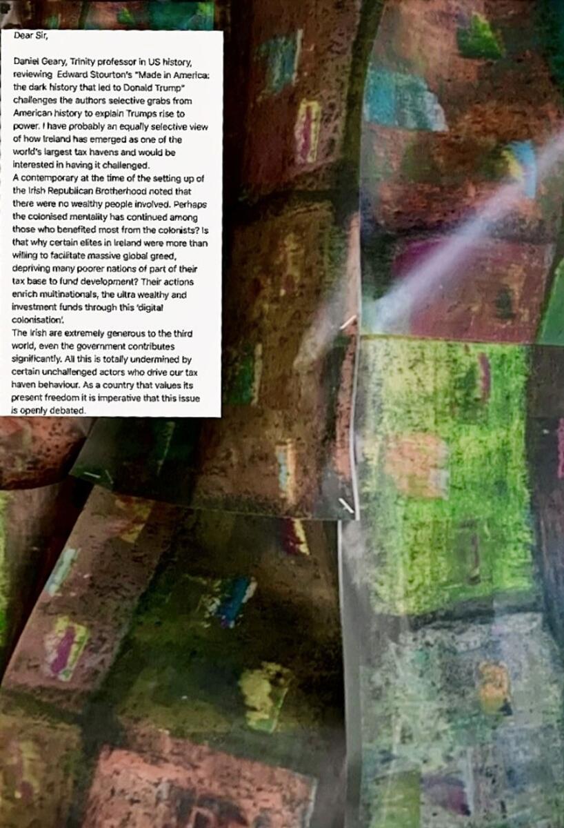 Inspired by a decade of writing letters to the editor of The Irish Times critical of how sectors of the Irish state pander to the desires of major corporations eager to minimise their tax bills, Paul’s exhibition at Johnston Central Library in Cavan, will consist of a mixture of his written letters stitched alongside some of his striking art work.