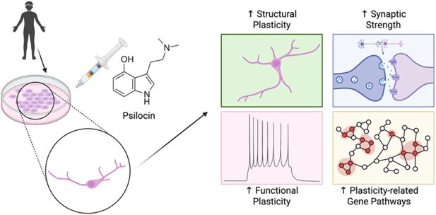 Human induced pluripotent stem cells (iPSCs) generated from adult tissue can be differentiated into cortical neurons in culture. Exposure to psilocin, the active metabolite of the classical psychedelic psilocybin, increases structural complexity, strengthens synaptic connections, enhances neuronal activity, and alters gene pathways associated with neuronal plasticity.