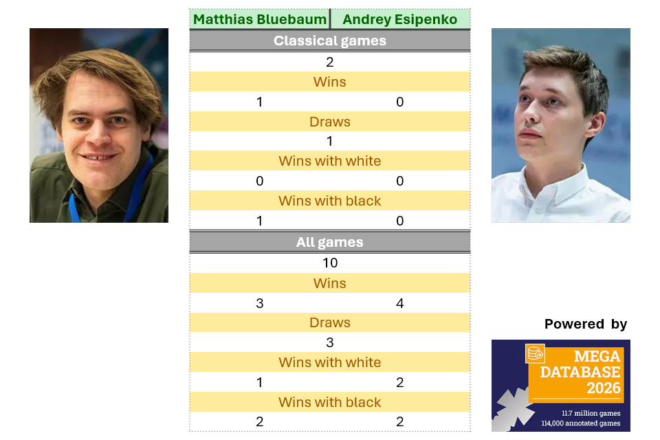 Matthias Bluebaum and Andrey Esipenko only played two classical games. Bluebaum beat Esipenko with black at the 2016 Aeroflot Open.