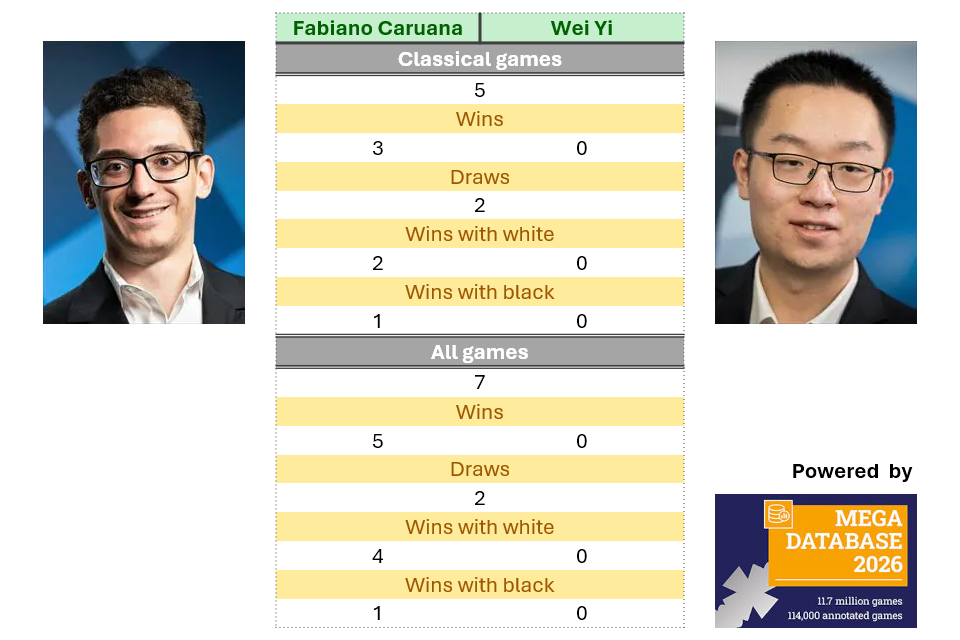 There is no record of Wei Yi ever obtaining a win over Fabiano Caruana. Furthermore, Caruana won three of the five games they played against each other. The US star won their last two confrontations, both at the 2025 Norway Chess event.