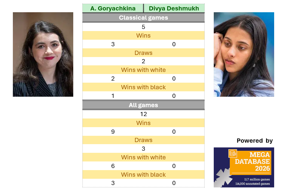 Divya Deshmukh has never defeated Aleksandra Goryachkina as per the Mega Database records. Moreover, Goryachkina won all six games in which she had white against Deshmukh, including their two classical games with that colour combination.